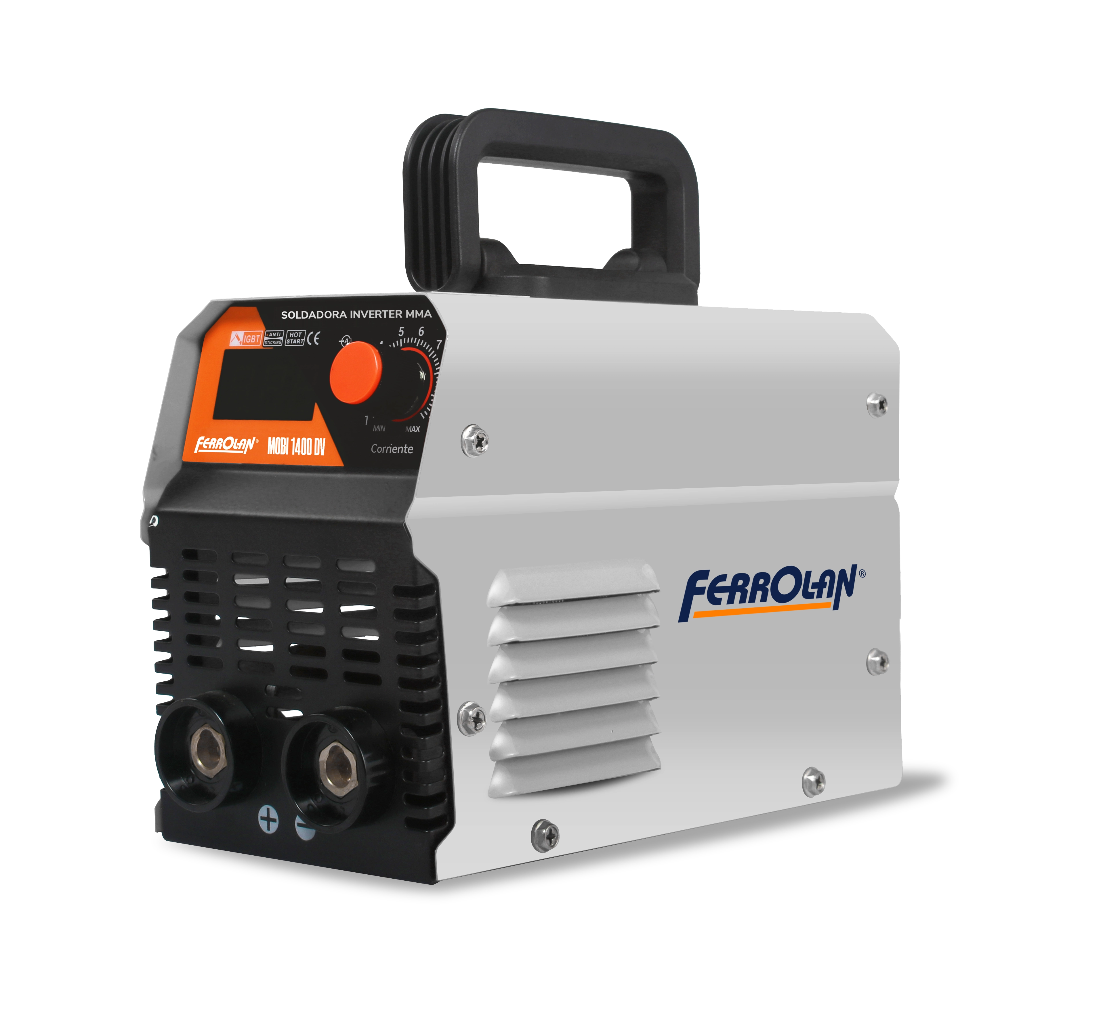 Máquina inversora MMA de fácil configuração com função antiaderente e hot start.